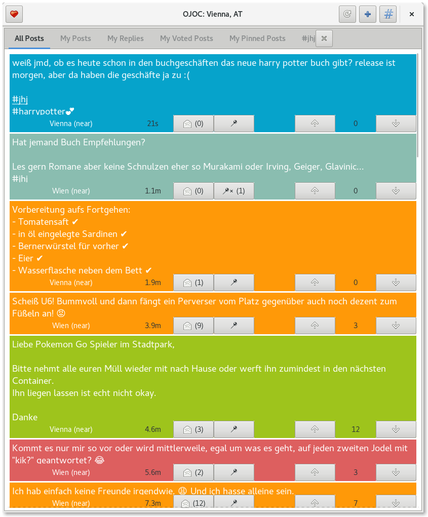 OJOC (https://bitbucket.org/cfib90/ojoc) is a client for the JSON API (https://api.go-tellm.com/api/v2) exposed by the Jodel server.